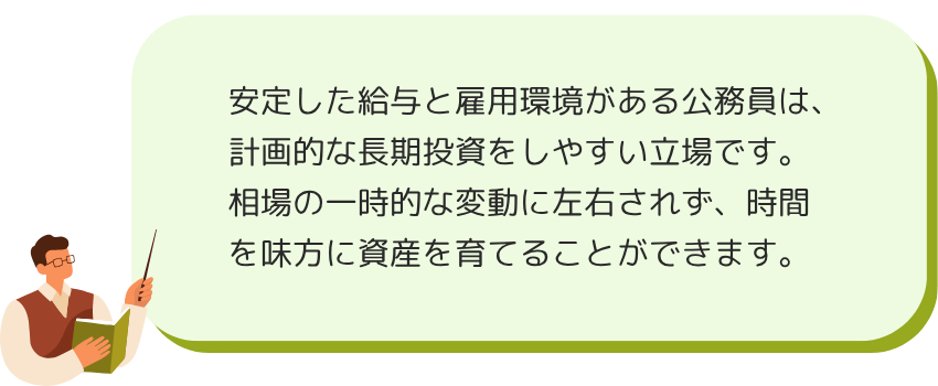 この安定性により、公務員は次のような資産運用のメリットを享受できる。