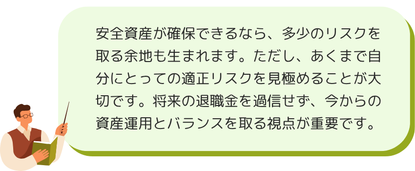 退職金という大きな「安全資産」が確保できる見込みから、現役時代はより積極的な投資戦略が選択可能である。たとえば、株式への投資配分を高めに設定し、長期的なリターンを重視する運用ができる。
