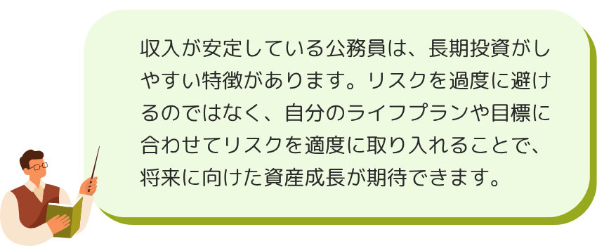 公務員は安定した収入があるため、一定のリスクを取る余地がある。しかし、資産運用によってそもそも確保できている安定性が損なわれてしまっては、本末転倒だ。