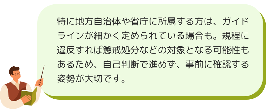 職務上の立場から、利益相反には特に配慮が必要である。職務上知り得た情報を利用した取引や、担当業務に関連する企業の株式取引は避けるべきだ。