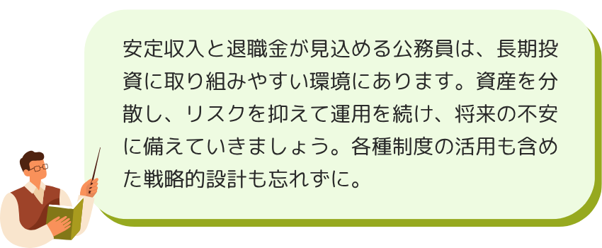 公務員は、その職業特性から資産運用に取り組みやすい環境にある。安定した収入を背景に長期的な投資がしやすく、将来の退職金も見込めるため、この好条件を活かさない手はない。