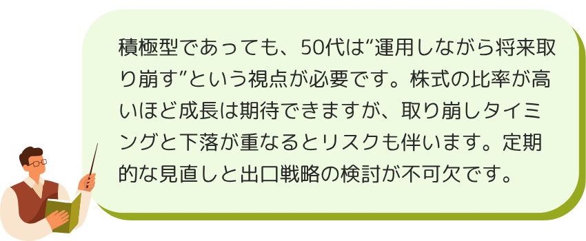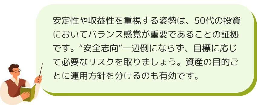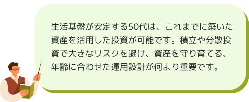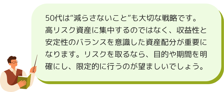 50代は若い世代と異なり、大きな損失をその後の運用でカバーする時間が少ないため、ハイリスクな投資は控えたほうが良いだろう。
