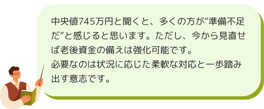 特に、より実態に近い数値である中央値は745万円と、退職後に長い老後生活を送るには不安が残る金額だ。