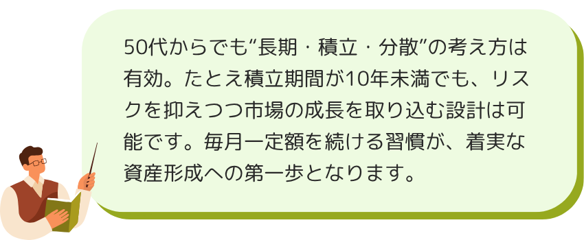 50代で資産運用を始める場合は、「長期・積立・分散」投資を意識して、リスクを抑えつつ安定的な収益確保を狙うのがおすすめだ。