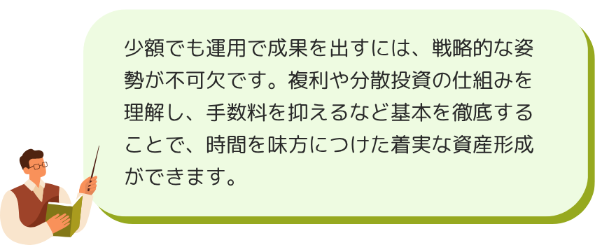 少ない金額であっても長期期間運用をすれば、リスクを抑えながら結果的に成果を上げられることが多い。