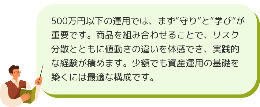 大きな額を運用するからこそ意識したい分散投資を主軸とし、リスクを抑えた組み合わせにした。