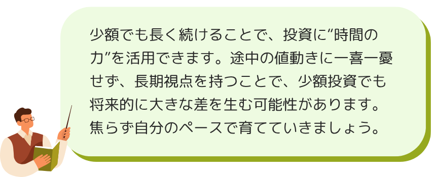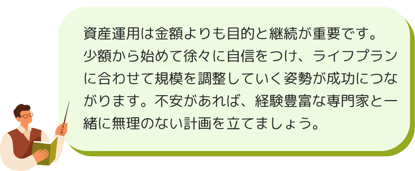 資金が少ないからと投資を見送らず、小さな額からでもコツコツと続けることを意識してほしい。