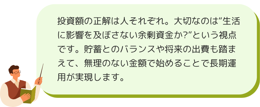 運用の途中で急な資金が必要になり、不本意なタイミングで売却してしまわないように、長く運用できる金額かも確認しておこう。