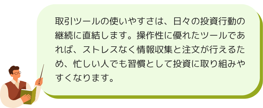 また、取引ツールはスマートフォンでも使いやすいように設計されており、移動中や外出中でも手軽に取引が行える。