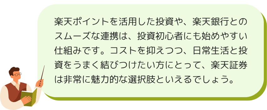 アンケート結果で見られた評判を踏まえると、楽天証券には下記のようなメリットが挙げられる。