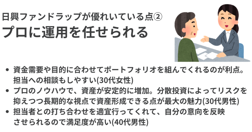 数多くある投資商品の中から、日興ファンドラップを選んだ理由を教えてください。