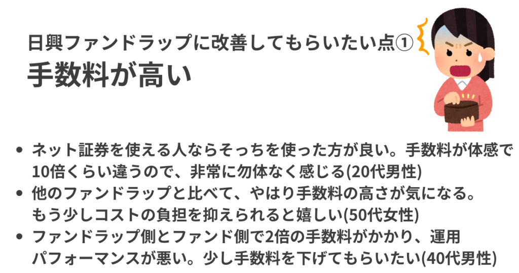 日興ファンドラップの評価については、良い点・悪い点ともに回答者から様々な意見が挙げられた。