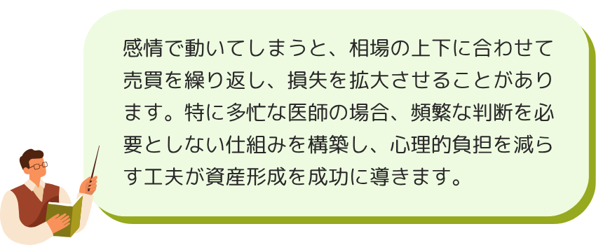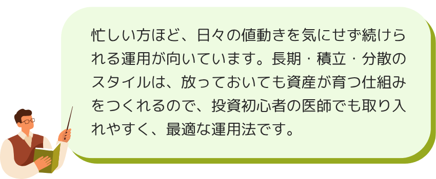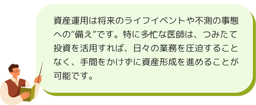 医師にとって、資産運用は単なる余剰資金の運用ではなく、将来の安定した生活と診療に専念するための基盤づくりが重要なポイントとなる。