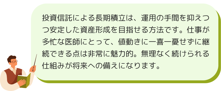 医師に適した資産運用の代表例は、投資の3原則「長期・積立・分散」を満たした投資が可能な投資信託の長期積立だ。