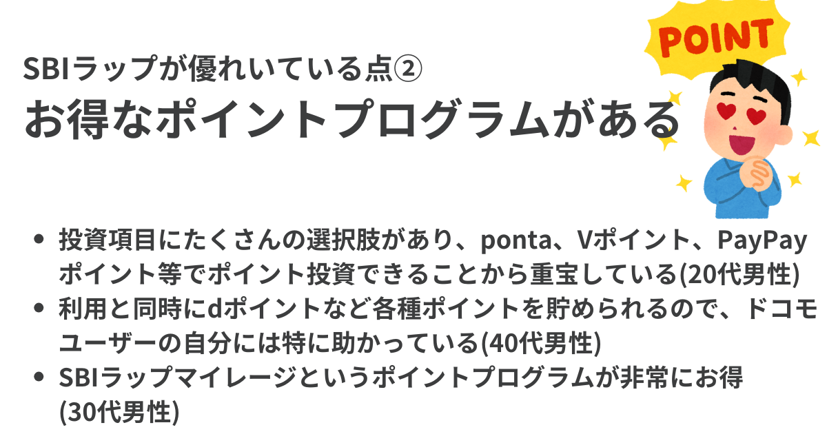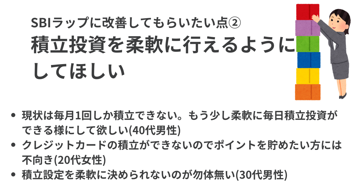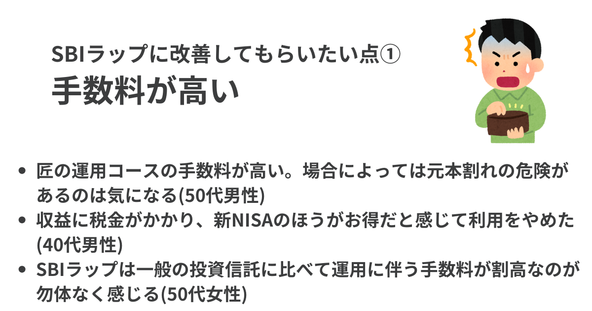 - SBIラップのメリットには「長期投資に向いている」「お得なポイントプログラムがある」などが 挙げられ、反対にデメリットには「手数料が高い」「積立投資が柔軟にできない」などが指摘されていた。