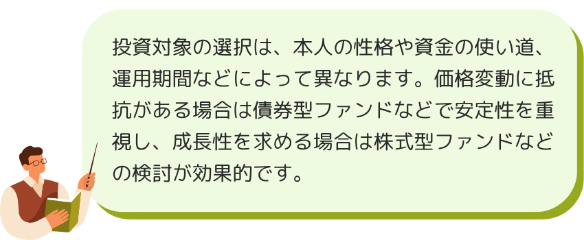 投資信託での運用を行う際は、リスクを抑えつつ安定的な成長を目指せるバランス型ファンドや、成長が期待できる分野に特化して投資するセクター別ファンドがおすすめだ。