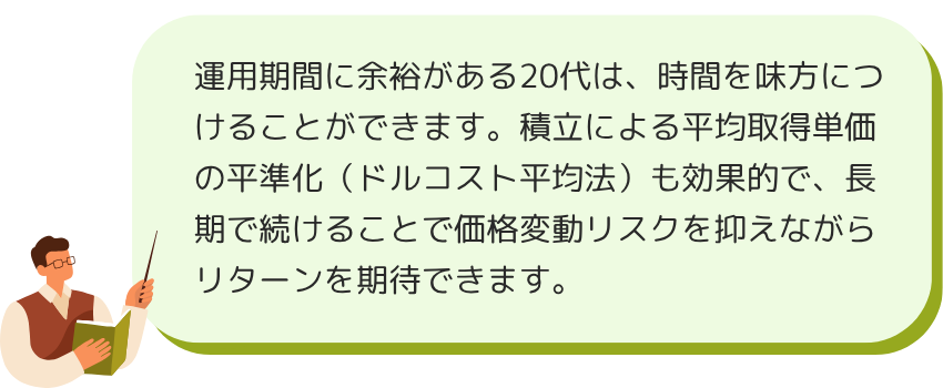長い時間を運用に充てられるため、仮に多少損失が出たとしても長期投資を続けることで損失を取り戻せる可能性が高い。