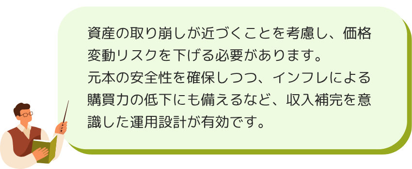 70代以降では、退職金の運用や年金の補完として、安定的な資産運用が求められる。