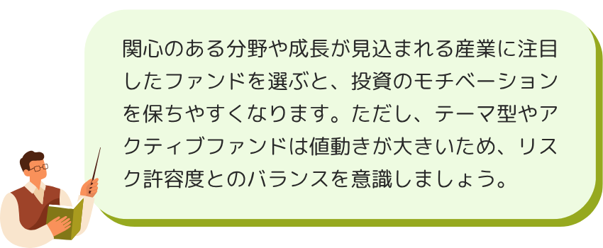 リスクをとって積極的にリターンを狙いたいという方は、テーマ型ファンドや独自の運用戦略に基づくアクティブファンドなどがおすすめだ。
