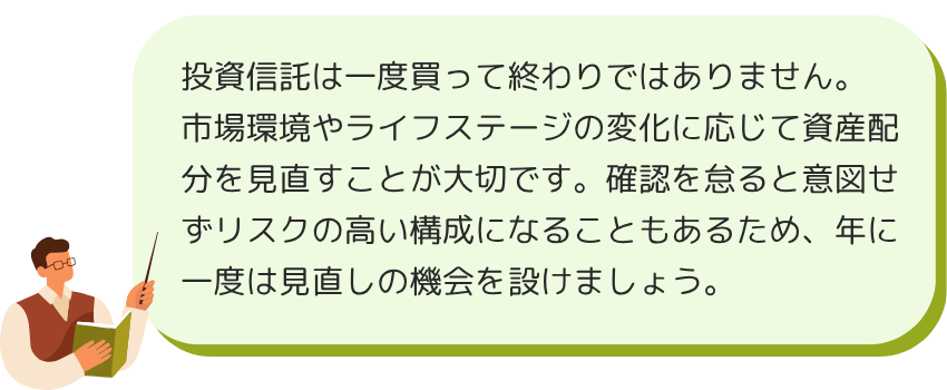 - 定期的にポートフォリオや運用商品の見直しを行う